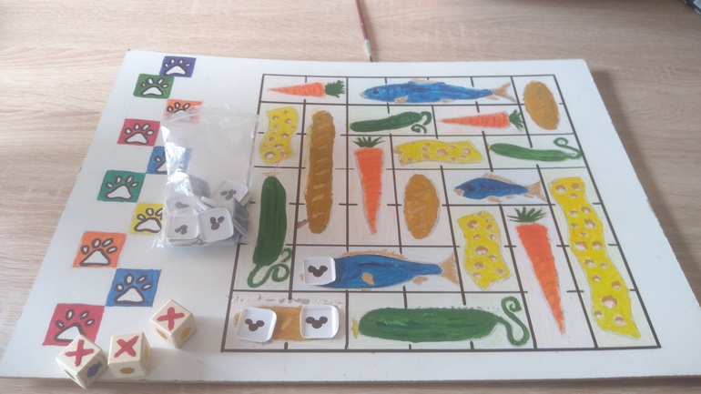 Очень симпатично у Вас получилось! И коты отличные! Мы с дочкой тоже уже 3 день в самоделку Мышиной команды играем. Очень нам нравится. Вот только проиграть нам так и не удалось ни разу... Сегодня усложненное поле нарисую. Вы по оригинальным правилам играете или какие-то хоумрулы ввели?