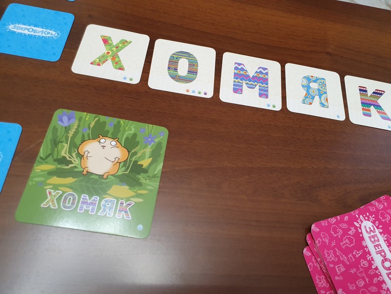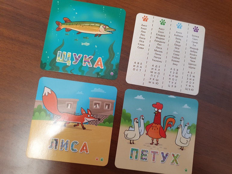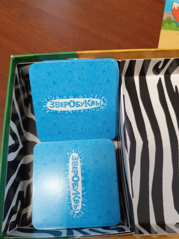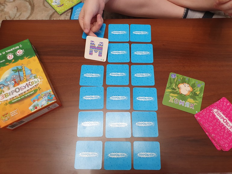"Зверобуквы" куплены очень давно, еще до увлечения мною настольными играми. Раньше я покупала игры как обучающе-развивающий материал, поэтому неудивительно, что эта игра удосужилась чести попасть в наш дом)). Начали играть в неё еще до того как Ильдар знал все буквы и читать он в то время не умел. Игра ему сразу понравилась. Играли в неё достаточно часто. Карикатурный стиль рисунков нам понравился. Единственное качество комплектующих, я имею ввиду тонкий картон карточек, и качество коробки ну никак не соответствует запрашиваемой на эти игры цене. Ну прям тонюсенький картон. Мы играем очень аккуратно, но каждый раз при игре я переживаю, что кто-либо из нас может просто случайно помять карточку, так как они очень сильно скользят на любой твердой поверхности. Например на такой доске от стола просто не возможно играть в эту игру.