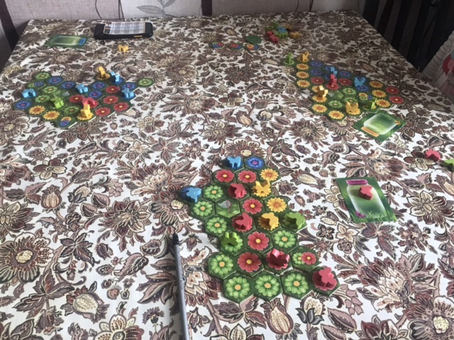 Не знаю за что он полюбил эту игру, я вообще заметила за мужем такую особенность, он очень любит что-то создавать: строить, выращивать, развивать. Крайне не любит агрессию и прямые конфликты, хотя нужный тайл увести может. Сегодня ему опять не повезло, занял третье место, я на первом, дочка за мной. Интересно разлюбит ли он игру или будет продолжать просить играть в неё? 😄. На троих тайлов и бабочек на человека выходит совсем мало, как там на четверых строить поляны? Интересно кто-нибудь пробовал играть с картами целей? Мне они немного несбалансированными кажутся...