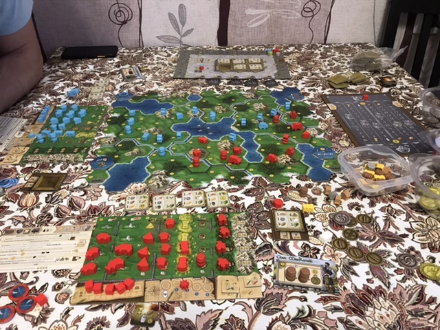 Мы с мужем набрали сегодня равное количество очков, я ушла в науку, а он в войну и синие карты. Прекрасная семейная игра, боюсь может наскучить после n-нного количества партий, но есть и дополнения.