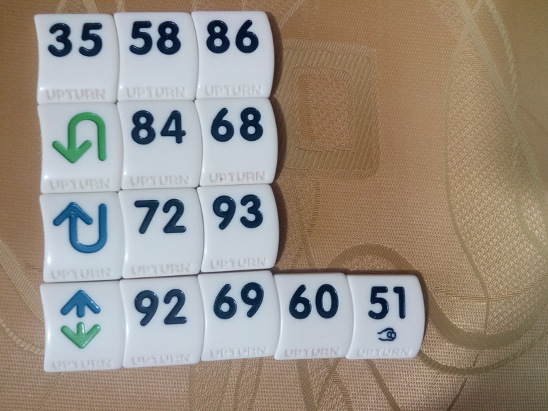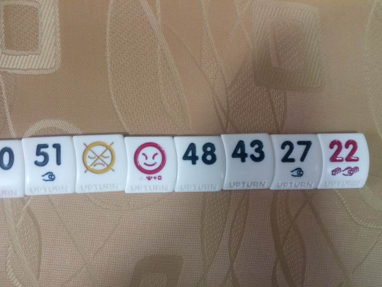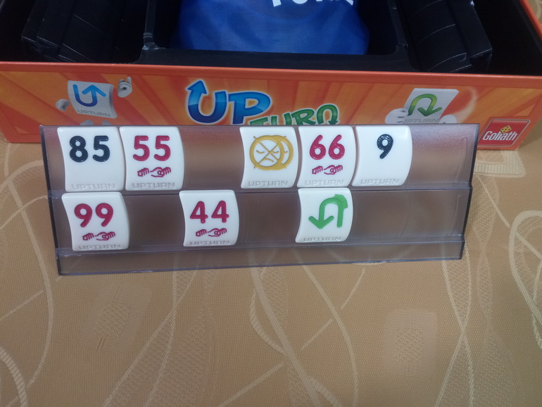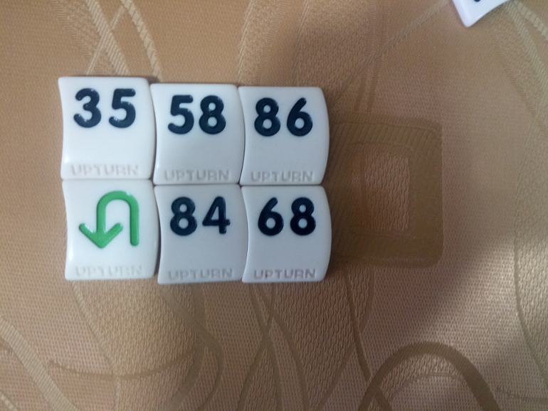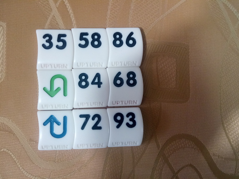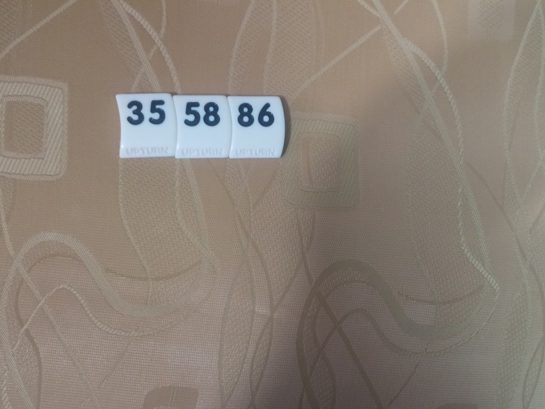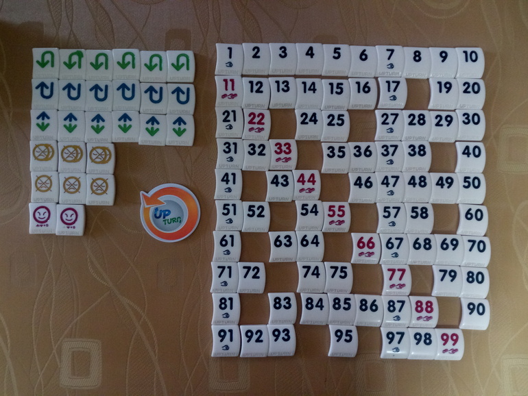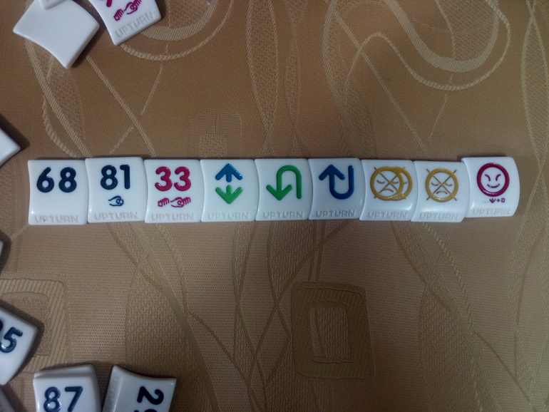 Обычные числа. Задача избавиться от всех фишек, выкладывая их в порядке возрастания или убывания. Когда остается одна фишка, надо предупредить об этом остальных иначе штраф - 3 фишки (привет, Uno!), закончить игру, равно как и начать ее, можно только фишкой с цифрой. Всем раздается по 7 фишек и одна из мешка выкладывается в центр поля. Кто будет первый, решает армреслинг;
