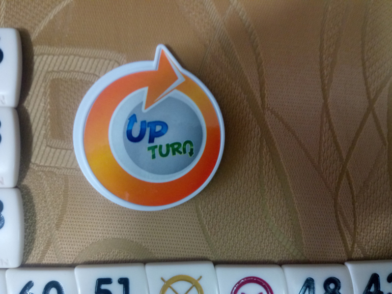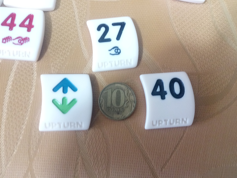Жетон направления. Поначалу мне показался какой-то бесполезной штукой - что я, сам не знаю, в каком направлении играем? Но после вдумчивого прочтения правил, стало ясно - выкладывая очередную фишку возрастания или убывания (Туда-сюда, Вверх и Вниз и Джокер), я могу также поменять и направление самой игры - по часовой или против часовой стрелки.