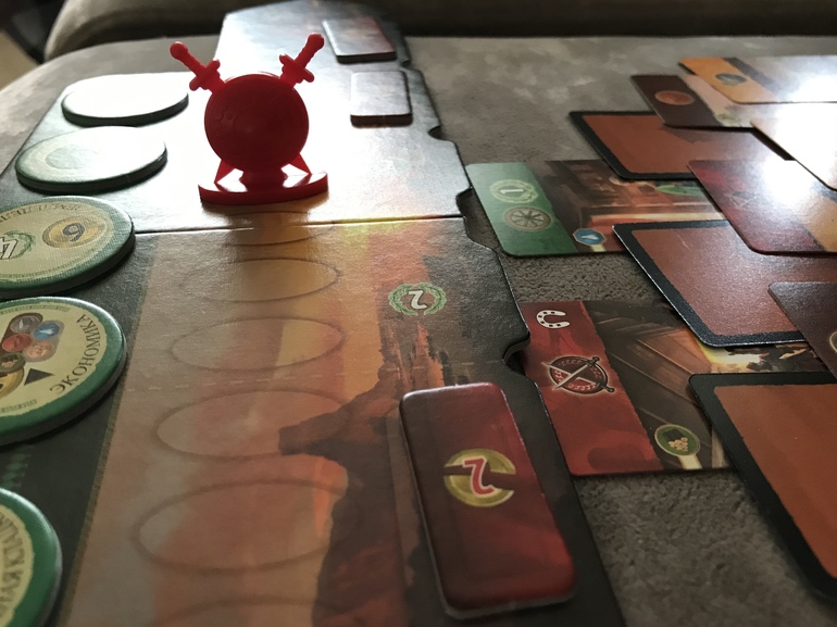 И здесь я быстренько заработала три трофея, потом пришлось устроить битву пирогами с мужем (хотя, он пытался на ходу ввести хоумрул, что персонажам с высоким показателем дружелюбия, как у меня, нельзя воевать, но не получилось). И я победила в битве и в игре. Обычно я играю дружелюбно, но после 7 чудес Дуэль захотелось повоевать)