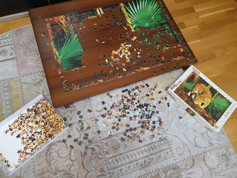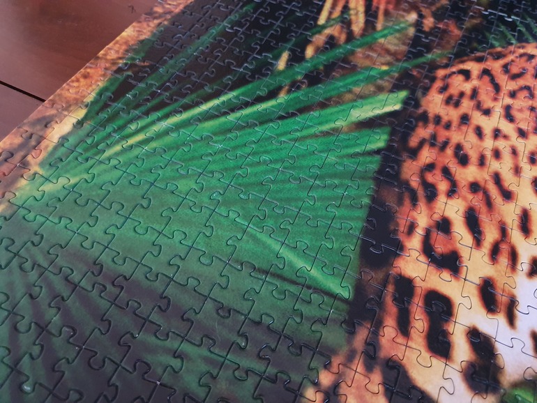 Думала, что самым сложным будет сам леопард, потому что его детали казались совсем одинаковыми, но оказалось наоборот, это было самым легким, так как можно было ориентироваться по рисунку шкуры, пятна оказались совершенно неповторяемыми, отличными от друг друга. А вот над листвой внизу пришлось попыхтеть). Там рисунок расплывчатый, оттенки деталей похожие, собирать было очень трудно.