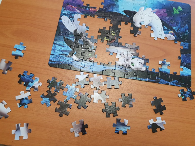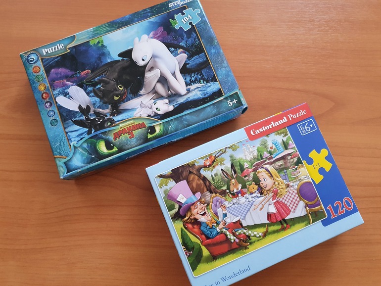 Пазлы мы с сыном собрали по очереди, сначала я , потом он). Правда с Беззубиком пришлось ему немного помочь, сложновато, картинка расплывчатая. Качество исполнения мне тоже не понравилось у Степпазла, коробка хлипкая, из сто пятьдесят раз переработанного картона. Сами пазлы тоже низкого качества, у двух деталей излишне срезан край, так что в этих места соединения образуются щели на картинке.