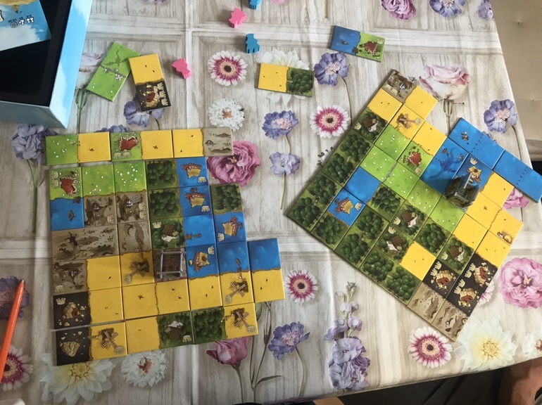 Впервые попробовали квадрат 7*7, что-то я не рассчитала свои силы и квадрат у меня получился сильно незавершённым 😆, несмотря на неказистый внешний вид, мое королевство принесло больше очков, чем королевство мужа). Игровой процесс довольно значимо поменялся, стратегию надо тоже менять).