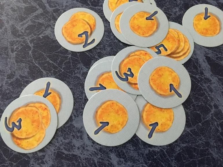 Вторым ходит лепёшечник. По броску кубика он определяет сколько лепёшек он напек и может пойти их продавать на рынок, но вещи нести продавать уже не может, но лепёшек может нести сколько угодно. Кстати в правилах вещи, которые несёт персонаж нужно выкладывать перед игроком, но мы их просовываем в середину фигурки (она же складывается пополам и образуется «кармашек»), так сразу наглядно видно, кто и что несёт.