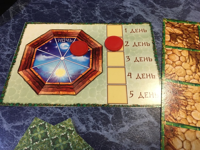 В игре участвуют городовой, гейша, лепёшечник, монах и помощник городового. У всех, кроме помощника, есть свой дом, в котором живет персонаж. На счётчик времени кладутся 2 пластиковые фишки, одна на ночь, вторая - на день 1. Городовой должен будет следить за временем. Но, когда играли с сыном, хотя он всегда был городовым, за временем следила я. Когда все игроки сходили по кругу, фишка сдвигается на одно деление (одно деление = 3ч), когда игроки сходят 8 раз и фишка вернётся на сектор «ночь», вторая фишка сдвигается на «день 2». В общем тут все как в жизни:ночь-день, сменяются сутки.