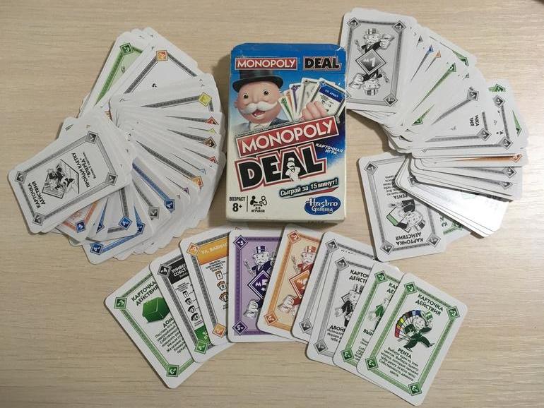 1. Монополия сделка. Играем втроём, мужу эта игра тоже нравится. Отличие от классической монополии в том, что это чисто карточная игра, играется быстрее, минут за 40 примерно, чем мне очень нравится. Есть три вида карт: улицы, карты денег (из них формируется банк игрока), карты действий, например, рента, на которых написано, к чему приводит действие карты. Игрокам раздаётся по 6 карт, в свой ход игрок берёт ещё 2 карты и может выложить 3 любых карты- улицу, действие или деньги - перед собой. Только выложенные на стол карты участвуют в игре, например, пи оплате ренты другому игроку, даже, если на руке есть деньги, оплатить ими ничего не получиться . Цель игры- собрать три комплекта улиц разных цветов.
