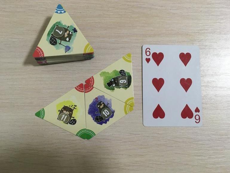 2. Боброугольник. Это аналог Триомино, но места занимает в разы меньше. Но конечно нет такого удовольствия как от костяшек. Нужно выкладывать карточки стыкуя уголки по цветам, записывая при этом баллы. Мы играем без баллов, пока кто-то не избавится от всех карточек. Если с собой взять только карточки, то игра не то, что в дамский клатч влезет, но и в обычный карман😉На фото размер карт по сравнению с игральной картой.