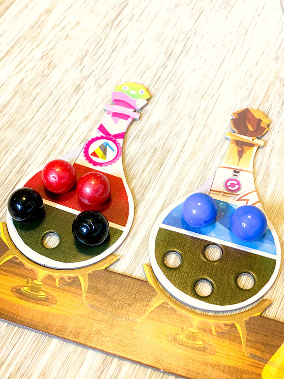 Лабаратория для нас игра медитативная, мы совсем не гонимся за очками, свойства зелий тоже забываем использовать, причём и я тоже. Нам нравится сам процесс, выбор шариков, их стук, выкладывание на колбы. Играем или до конца грамот, а их всего 4 на двоих, игра быстро проходит или до конца колб, если хочется продлить игру. Мне даже в конце очки считать не хочется, так же как и в Диксит не важен результат, важнее процесс.