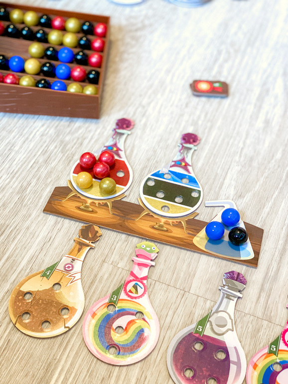 Мне Лаборатория напоминает первый Азул, тем, что нужно выбирать "фишки" для заполнения "карточки". И при игре в 4ом сложно спрогнозировать, что останется к твоему ходу.