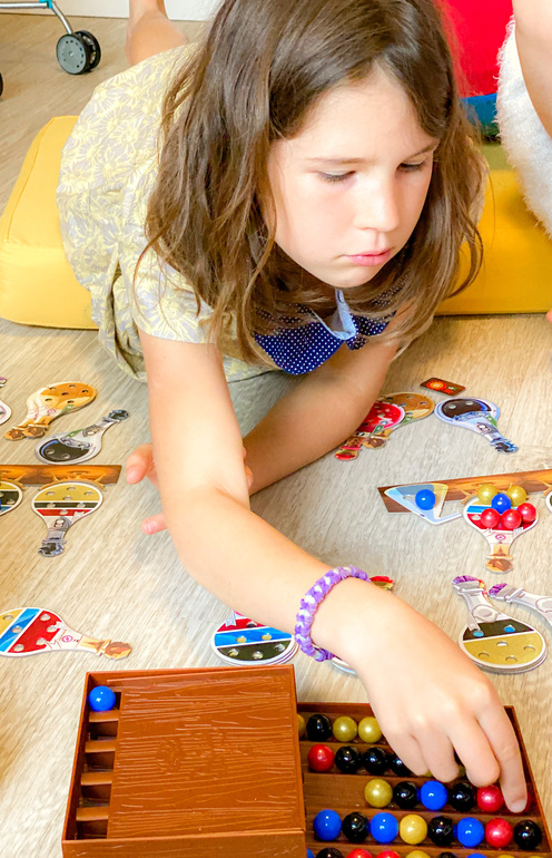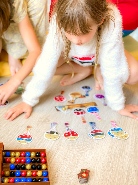 Добралась до шариков). Вот тут уже подключились дети, шарики хотелось потрогать всем 😄. Правила читать мне было некогда, рассказала примерно, что нужно брать один шарик и добиваться «взрыва» шариков одного цвета. Суть дети поняли сразу, я ушла укладывать спать малышку, а девочки сели якобы играть)), но без правил. Они просто брали себе зелья, даже не знаю сколько штук, и по очереди ходили забирали шарики и организовывали взрывы. Шарики лишние в конце хода с руки не скидывали, в общем полный хоумрул у них был. Зависли они не меньше, чем на 1,5 часа. Пока зелья не закончились, они спать не ушли. Потом ещё попросили мужа помочь им посчитать очки. Старшая победила). Так что первая игра им обеим понравилась, не могли оторваться.