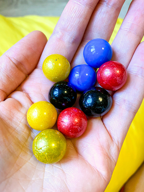 Блин, и это в игре за три тысячи рублей. Стыд и позор тем, кто кладёт такое внутрь. За эти деньги уж могли сделать шарик к шарику, неужели так сложно 🤷🏻♀️. В итоге поменяла самые плохие на запасные. Так желтые даже по цвету отличаются. В запасе все шарики яркие и блестящие. Когда шарики стала проверять после двух игр, ещё и выяснила, что одного не хватало 🙁. Добавила запасной, видимо на такой случай они там и лежат.