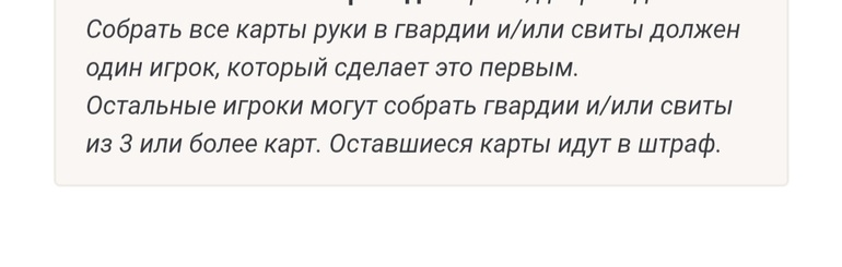 Как только игрок выложил все карты с руки, остальные игроки выкладывают все, что им удалось собрать. Если есть какие то свиты или гвардии (минимум 3 карты) их выкладывают, все остальные карты идёт в штраф.