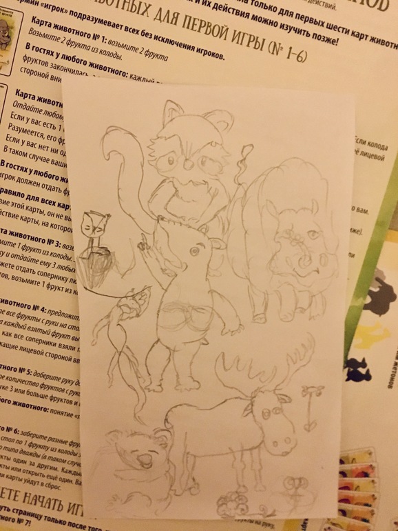 Из-за допущенных накануне ошибок сегодня было принято решение начать сначала. Успели мы провести пять раундов или глав, не знаю, как правильно назвать партии в формате этой игры. По итогам : у меня-7 баллов, у дочки и сына по 4 балла. На стол вышли карты с 18 номером, но ушли носороги, муравьеды, так жаль было, хорошие ведь свойства. Пока нам всё нравится. Даже интересно, на сколько долго продлится детский ажиотаж вокруг коробки. Пока мы с сыном думаем над ходами, дочка успевает и порисовать :