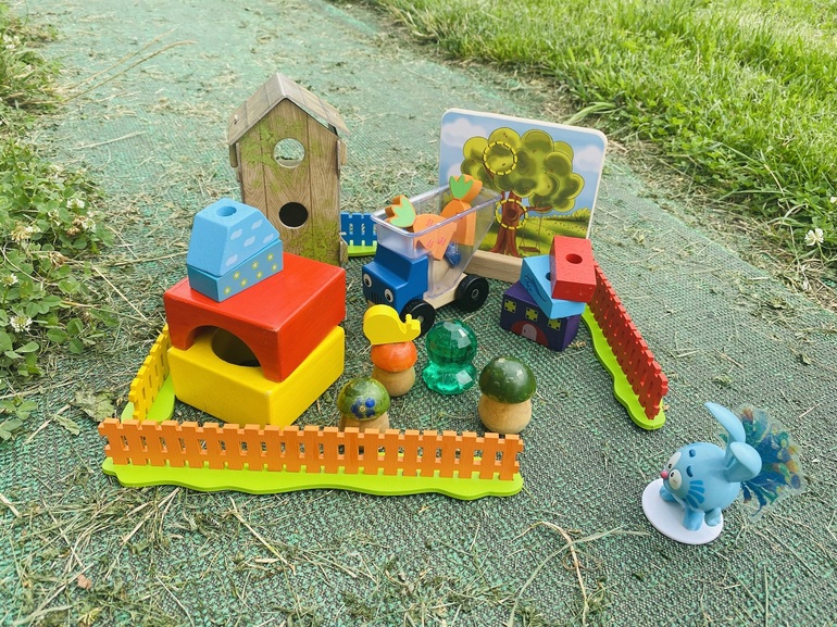 На первой вижу горшок из Каменный век Джуниор, грушу из Фруктового сада от Хаба (малышовая версия), дерево с яблоками - тоже фруктовый сад от Хаба уже из полной версии?