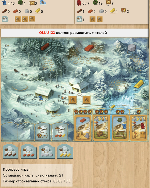Дальше я освоила Каменный век. И первая же игра была у меня на зимнем поле с дополнительными правилами. То есть итак ничего не ясно, так как первая партия, а тут ещё и расширение, правил к которому нет на русском языке. Только потом я научилась задавать условие, чтобы искать партии без дополнений, например. Или указывать максимальное число игроков. В Каменном веке мне повезло играть две партии пошагово с соперником, которые делал ходы быстро. Мы с ним за два дня сыграли в две партии. Следущая моя партия растянулась на три недели и закончилась ничем, так как один из игроков просрочил свой ход.