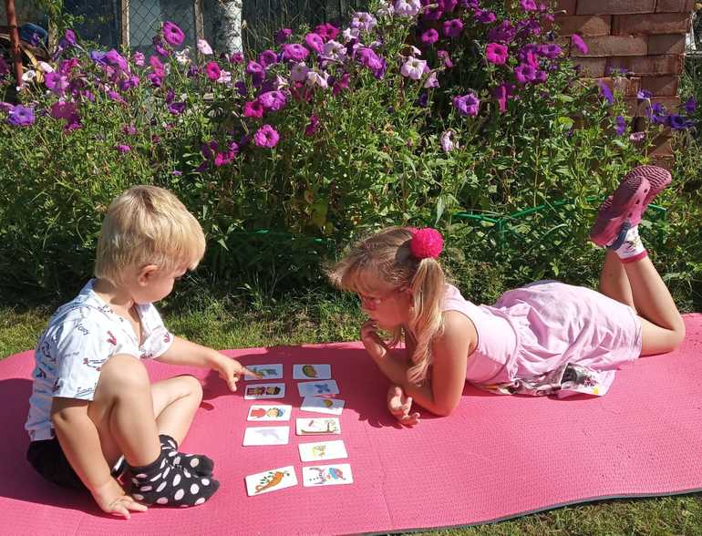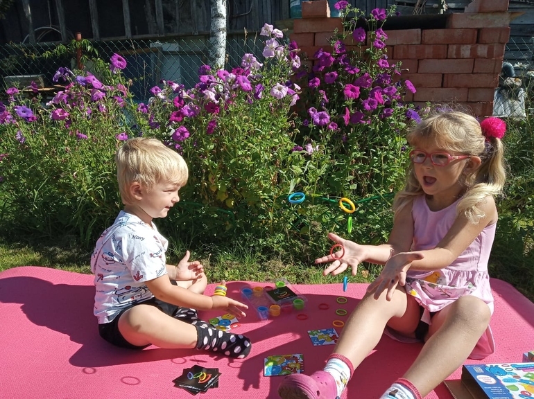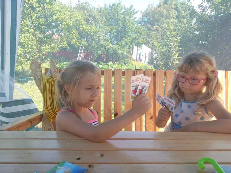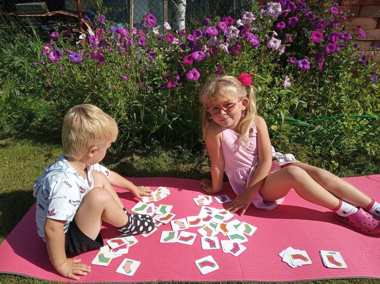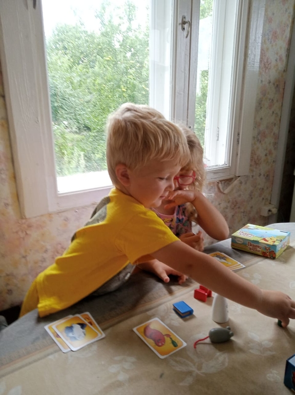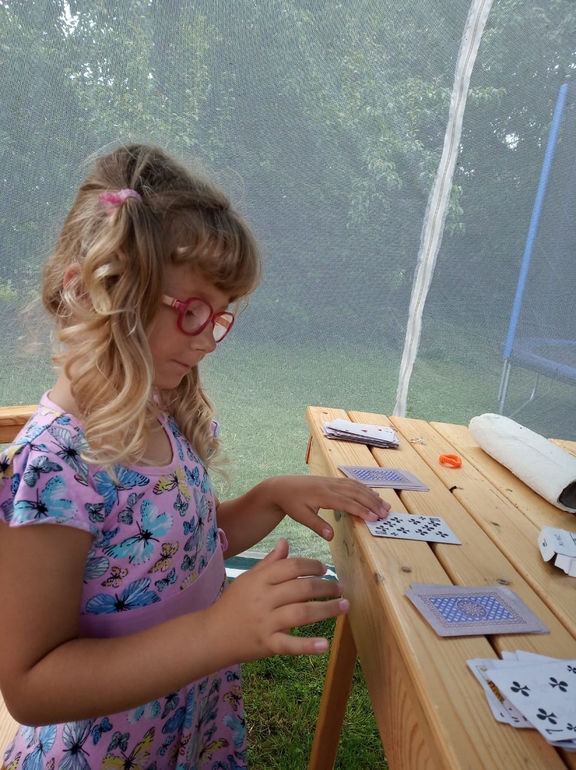 Когда ездили в деревню, дочка нашла колоду карт. Я на свою голову научила ее играть в пьяницу)) Играли долго, больше получаса, ещё и с колодой с мелкими, Лиза в итоге выиграла, потом ещё и второй раз начали, но уже не доиграли, на след день опять попросила - недоиграли)
