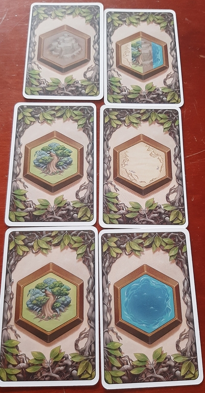 Мы перемешиваем колоду и по очередности переворачиваем по 2 карты. В зависимости от того, что там изображено, проводим линию и соединяем 2 соседние клетки. Например, если вам очень нужны лес и пустыня, а выпало 2 водоема - ничего не попишешь, нужно искать "окольные" пути. Всего типов местности немного - лес, водоем, пустыня, горя и карта-джокер, которая может быть любой местностью.