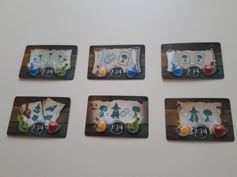 На каждой из них для красоты изображена одна из четырех ведьм, входящих в Колдовской совет Чернолесья. Цвет наряда ведьмы совпадает с цветом зелья. Имея зелья определенных цветов можно купить свиток заклинаний. В левом углу карты на бутылочке с зельем указаны очки репутации, которые получит ведьма, сварив это зелье. В правом углу - количество монет (вознаграждение ведьмы за сваренное зелье). Также на карте зелья изображены ингредиенты, которые нужны, чтобы сварить это зелье.