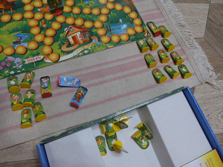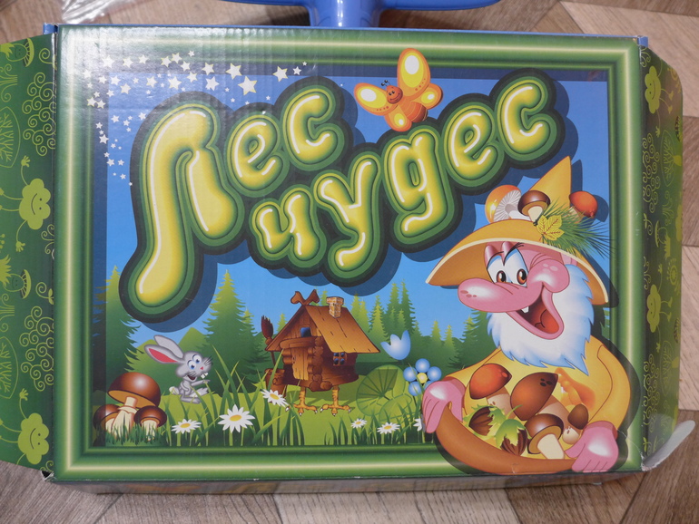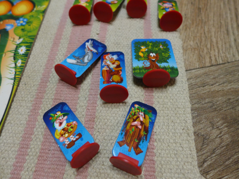Где-то и когда-то я прочитала на неё положительный отзыв, стоимость показалась невысокой, и я взяла попробовать. Игра совершенно несложная. Ходи по полю, грибочки собирай, пакости соперникам. Коробка содержит ну ооочень много воздуха. Вот фишки нечисти (баба Яга, Волк, Лесовичок (он здесь положительный персонаж), Леший и некое Дерево (прототип я не смогла вспомнить из литературы). 4 фишки игроков представлены компьютерными рисунками двух мальчиков и двух девочек. Остальное на заднем плане - фишки грибов. Картон плотный, особых нареканий нет. Поле складное, два листа А4 (может немного меньше, специально не измеряла). Но бликует всё знатно, фото сделать трудно.
