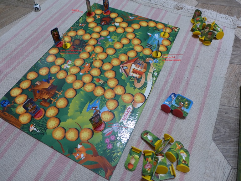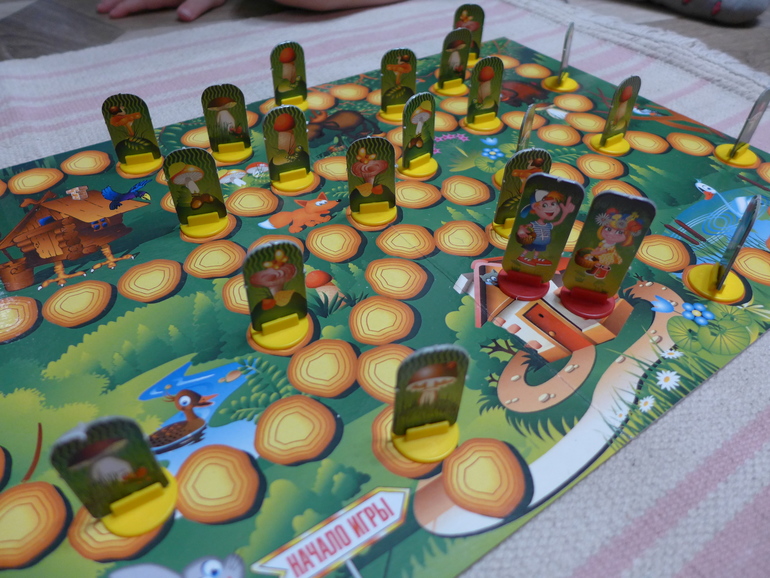Не могу назвать игру обязательной, ходилка с интересными элементами. Будь там другое оформление, авторские рисунки, а не компьютерные, наверное она была бы дороже. Но мне нравится, она простая, сильно мудрить не нужно, а вот подумать наперёд, как действовать, когда на поле редеют грибы - стоит, можно не гнаться за последним уловом, а потихоньку спускаться к домику, всё меньше потом платить за выход из леса. Ну и элемент пакости - это наверное не всем детям зайдёт, моя приняла на ура.