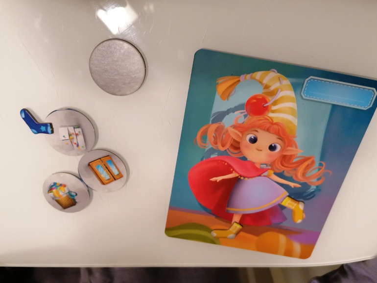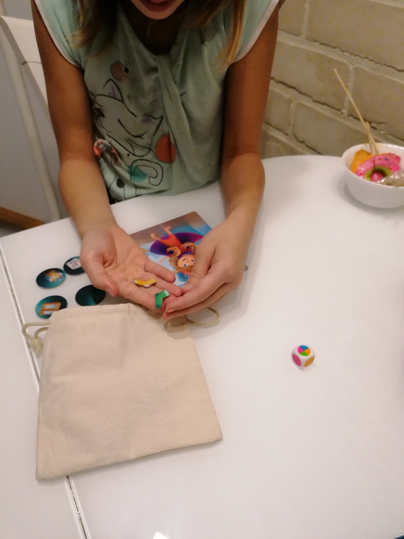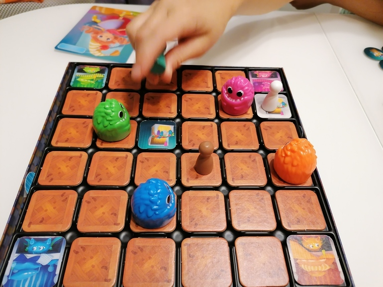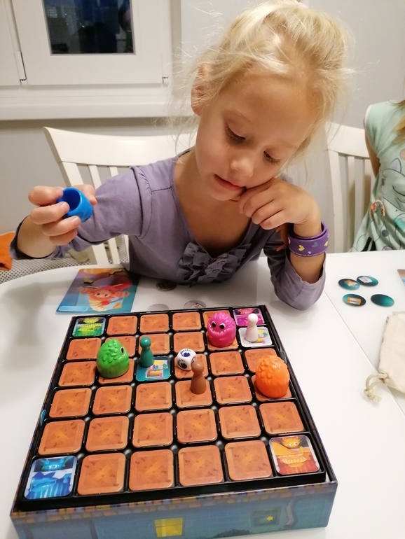 Итак, много классных компонентов и разных действий - приятный мешочек для носков, сами монстры, кубики, эльфы, тайлы. Но по моим ощущениям как то всего слишком много. Сам процесс игры меня не увлёк, нет особой стратегии, ходишь в основном на удачу, часто нужный тайл бывает занят. Например я подсмотрела зелёным монстром тайл, это мой коричневый комод а зелёный монстр все стоит и стоит, перемещаются другие, потом через 3 хода он ушёл а мне уже и не нужен этот комод. Так как каждого предмета и цвета по 2 тайла. Коричневый и чёрный похожи, нет контраста, я все время путаю их, так как мне досталась коричневая фишка. Дети выбрали себе белую и зелёную.
