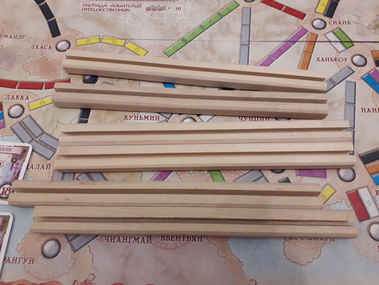 Для этого в коробку положены дополнительные вагончики, увеличенное количество карт маршрутов (60 штук) и вот такие симпатичные и хорошо обработанные подставочки: