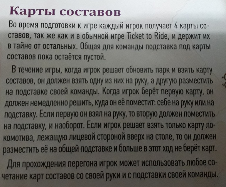 Режим командной игры я не могу назвать полностью кооперативным. Несмотря на то, что пара играет вагончиками одного цвета, у каждого своя "рука" и часть информации скрыта. У партнёров есть подставка с общими маршрутами и общими картами вагонов.