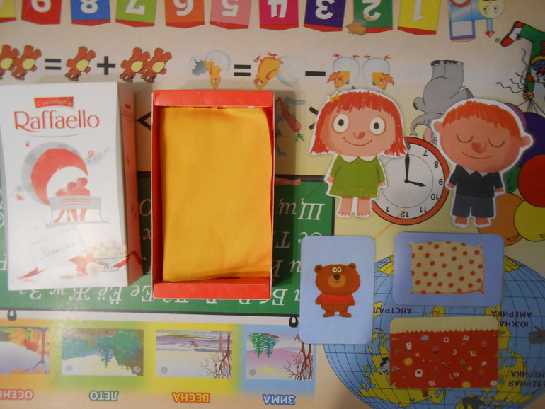 Суть игры проста. Один игрок (ребенок), один ведущий (родитель). Коробка (у меня от конфет) выступает в качестве кровати. В кровать укладывается кукла (мальчик или девочка, по выбору ребенка) бодрствующей стороной вверх. Карты делятся на 3 типа: «спальный комплект» (одеяло, подушка и любимая игрушка), солнышки и «призовые карты». Колода карт кладется рубашкой вверх, и игрок тянет по одной карте. Если выпадает спальная карта, то она кладется в коробку-кроватку. Если призовая - откладывается в колоду игрока. Если выпало солнышко, то из колоды призовых карт игрока нужно убрать столько карт, сколько выпало солнышек. Цель игры - насобирать как можно больше призовых карт, перед тем как соберется «спальный комплект».
