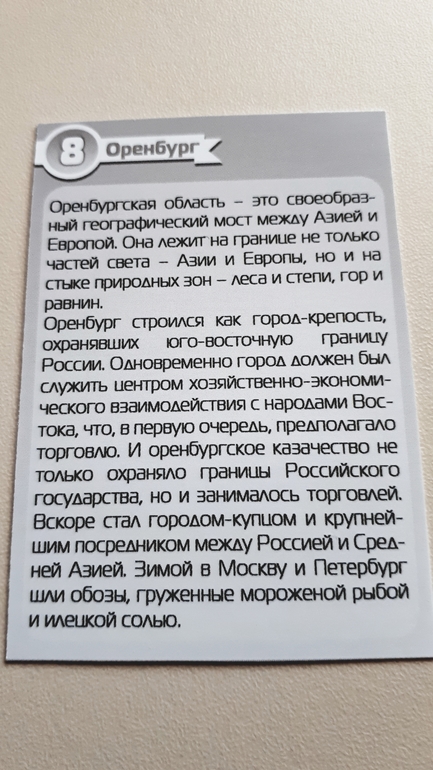 Виктория, хорошо, что Вы написали про Оренбург. Я про Вас помнила, когда эту карточку фотографировала для отзыва. Вот слышала, конечно же, сама про платки, но не вспомнила почему-то. То, что в карточке не написали про платки, означает, что не потрудились выбрать более интересную и понятную для детей информацию. Меня в тексте карточки про Оренбург больше всего смутило, что не объяснили, откуда соль и рыба). Речь шла о торговле с Азией, а потом вдруг бац... про соль и мороженую рыбу.