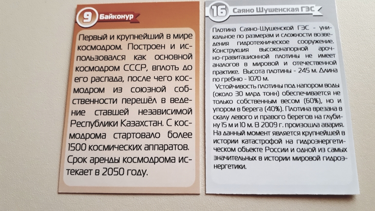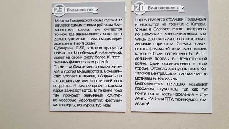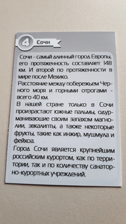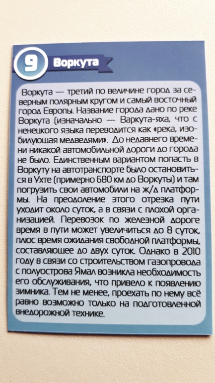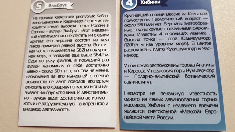 Но в игре кроме путешествия по карте есть еще один познавательный момент. Попав на достопримечательность, можно прочитать информацию о ней на обратной стороне карточки. Интересно, что достопримечательностями в игре выступают не только крупные города (хотя в основном они). Встречаются и мелкие населенные пункты, а также другие географические объекты (горы, острова, архипелаги).