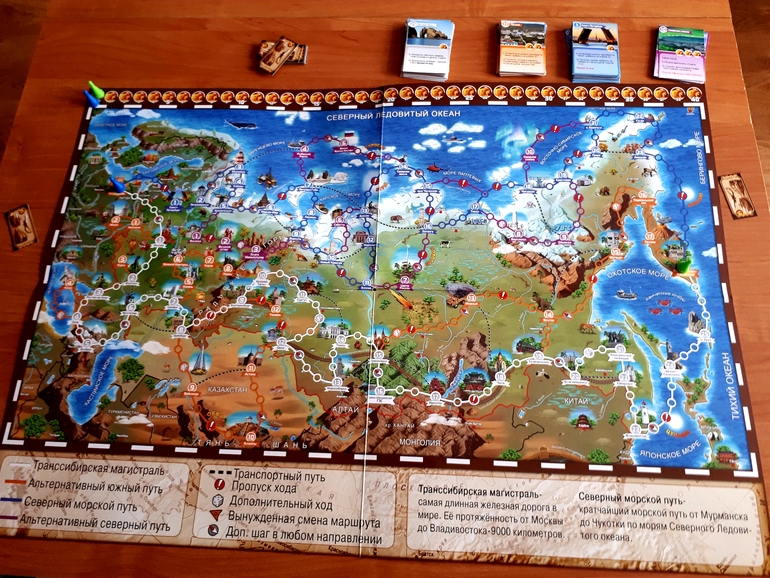 В простой вариант мы с дочкой не играли. Но после прочтения правил становится ясно, что маршрутов для этого варианта всего 2. Белой линией на поле обозначена Транссибирская магистраль, а синей - Северный морской путь. Дополнительные оранжевые и фиолетовые ответвления не используются, перемещения по черным пунктирным линиям тоже. Стартовать игроки могут из начальной или конечной точки любого из этих двух машрутов. Кто первый проходит выбранный маршрут, тот и молодец (победитель).