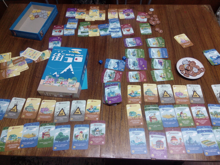 Мачи коро вроде такая компактная в коробке, а на столе- гигант. Нам нашего довольно большого стола хватает только на троих игроков, а за маленьким еле-еле с сыном умещаемся. Хорошая игра!