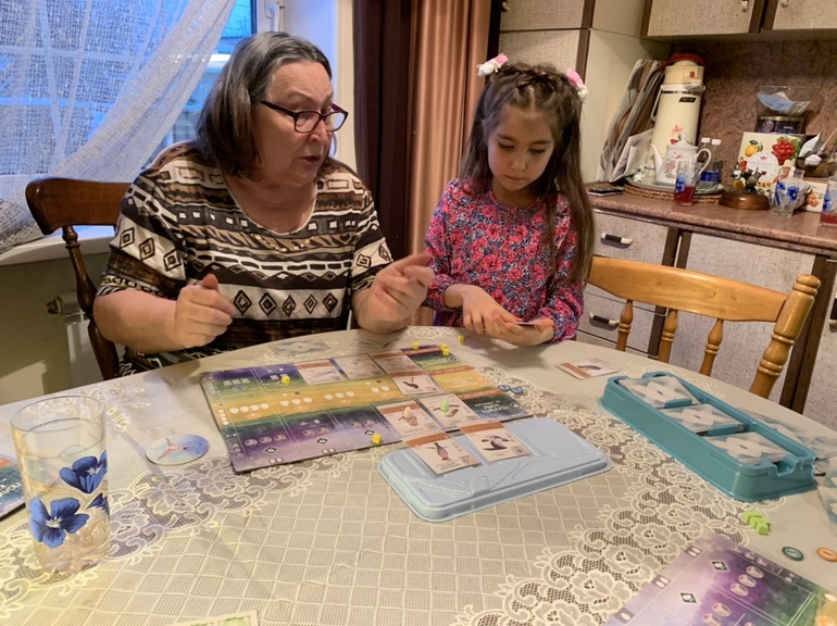 Тетушка наша вполне игровая, я чуть ниже писала, что в 7 чудес она опередила не только меня, но и своего и моего мужа, да и с другими играми она неплохо справляется, но с Крыльями случился затык). Самое забавное было то, как они с дочкой обсуждали очень бурно каждое своё действие и оба высказывали доводы за или против, партия сильно затянулась, но мы не скучали, глядя на них 😄.