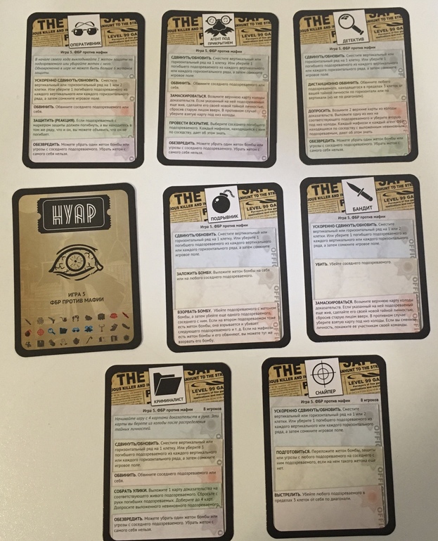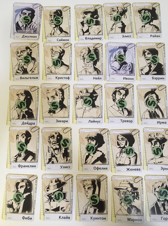 В игре есть двусторонние карточки- карточки подозреваемых, на одной стороне живой подозреваемый, на другой он погибший. Таких карт 50, половина из них с цифрами в нижнем углу, эти цифры будут нужны для последующих игр. Из 25 карт нужно сформировать поле размером 5х5 карт.