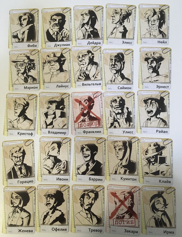 Есть и колода карт доказательств. Для игры нужно отобрать карты тех персонажей, что выложены на столе, половина из них также без цифр.