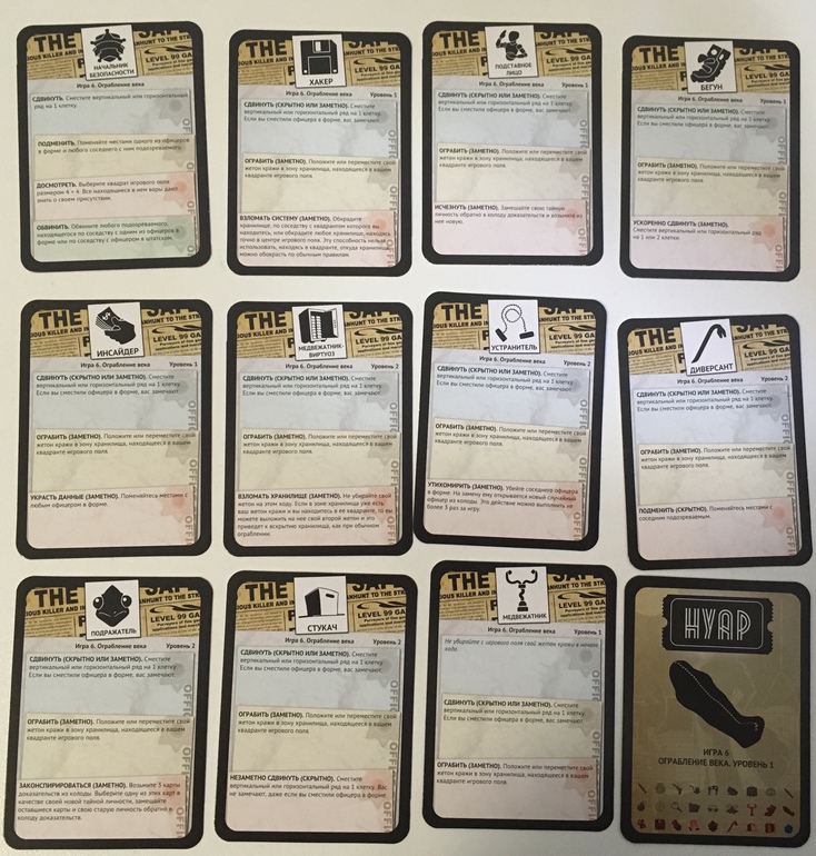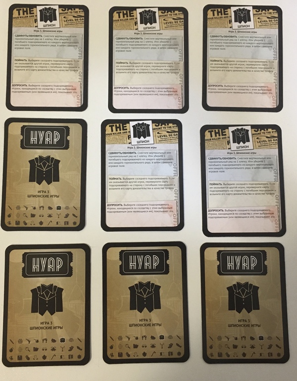 Ещё одна игра на двоих человек, которую освоили вчера. Выкладываются 25 карт, 5х5. На каждой карте подозреваемого выкладывается жетон сокровища. Вор берет в руку 3 карты из колоды доказательств и выкладывает одну из них перед собой рубашкой вверх в качестве тайной личности. Остальные карты остаются у него в руке для будущих маскировок.