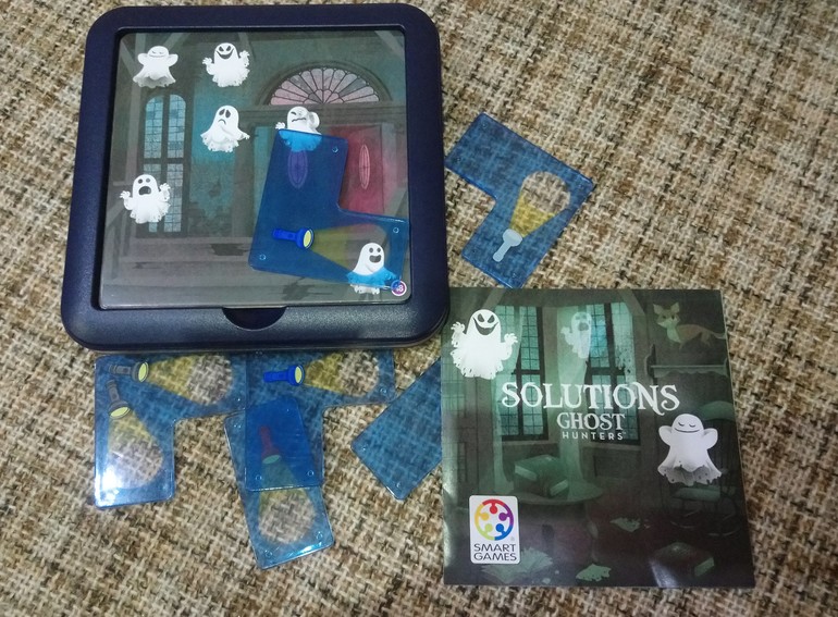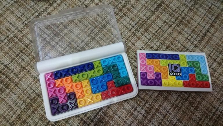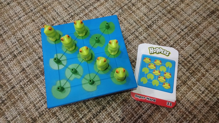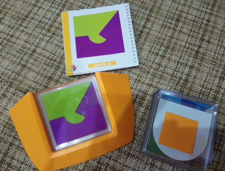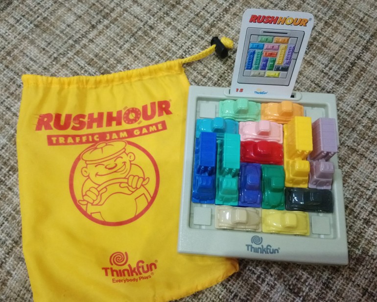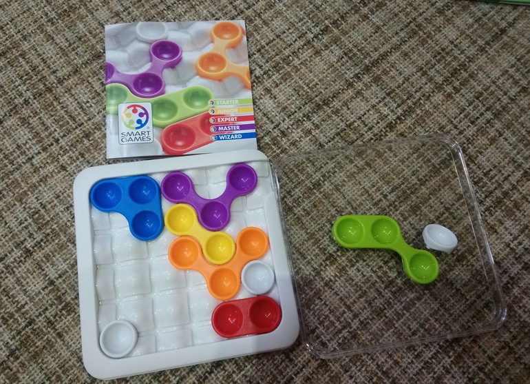 Именно эта головоломка досталась мне, пока дети разобрали свои. Головомка по принципу пятнашек, похожа чем то на час пик. Сложная, я в первый раз споткнулась на 26, потом на 35. Всего 60 заданий, пока ступор полный на фиолетовых уровнях, начиная с 37. Старшая дочка сказала что она доходила до 43. Очень приятная головоломка, детали классные.