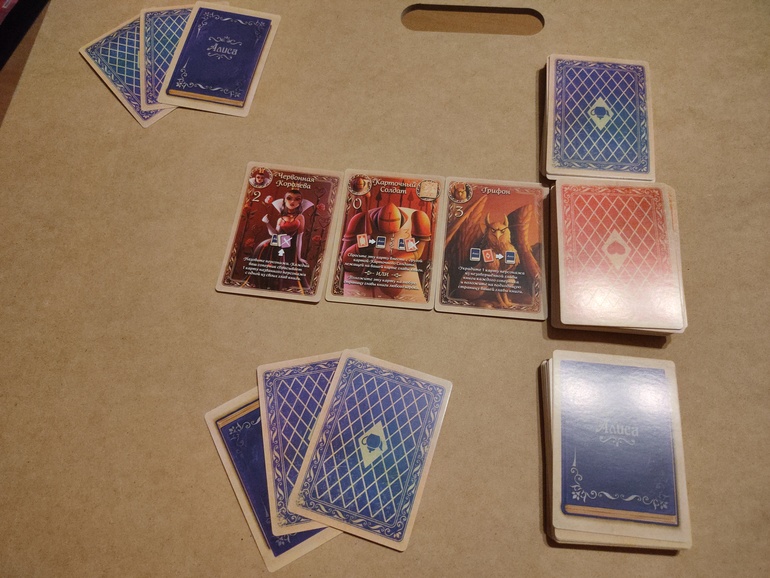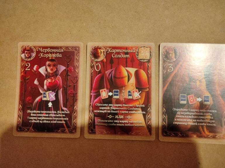 Морковкина, вроде бы больше не играли, не помню. Если и играли, то разок еще. Когда много игр и мало тех, с кем можно поиграть, это прям трагедия( Заглянула в правила: после розыгрыша карты персонажа его можно переместить на страницу своей книги, если он подходит. Карточного солдата можно в свой ход разыграть только одного, т.к. выкладывать персонажей или героев можно строго по возрастанию числа, указанного на карте. В следующий свой ход ничего не мешает опять разыграть карточного солдата и положить на другую страницу той же книги соперника.