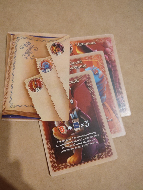 Карта главы книги выкладывается в конце хода во время волшебного вихря. Если ее сразу не удалось заполнить персонажами, она остаётся с открытыми страницами до следующего вашего хода. И да, на открытые страницы вашей главы книги соперник может положить Карточного солдата)