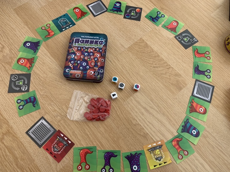 Игроки кидают кубики на которых выпадает 4 значения. Цвет лаборатории откуда сбежала амеба, ее вид, цвет и тип раскраски. Игроки руководствуясь всеми исходными данных должны найти ближайшую к лаборатории амебу. Самое интересное случается с беглянками, когда на пути их встречаются вентиляционные люки, в которые они забираются и пропадают из вида, или комнаты мутаций, где наши амебы могут поменять цвет, форму или тип раскраски. Раньше пяти-шести лет играть в неё, наверное, не стоит. Зато и взрослой компанией можно вдоволь повеселиться).