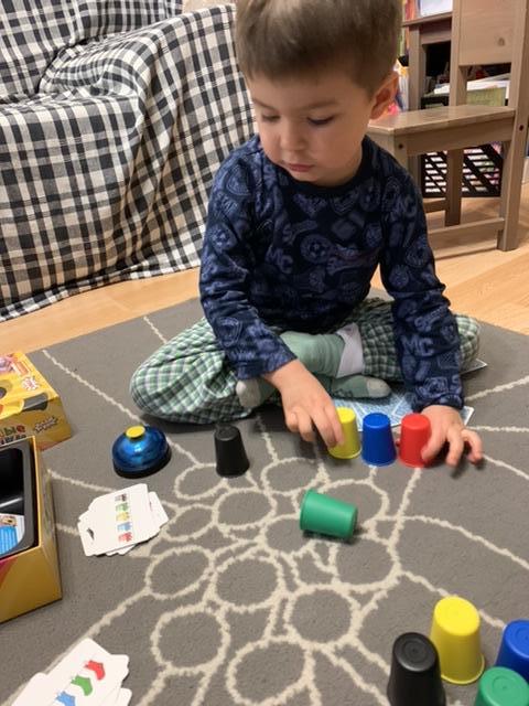 Отличная игра на скорость и зрительное внимание для самых маленьких. Дочка тоже играла в неё, но сын обладает большим терпением чем дочь в его возрасте, пока не пройдёт всю колоду, не успокоится. Напомню что в игре, участники должны выложить свои разноцветные колпачки в соответствии с картинками на карточках заданий. То есть в том же порядке по цветам. Ряды бывают как горизонтальные, так и вертикальные. На скорость у сына выкладывать пока не получается, поэтому мне приходится сильно замедляться).