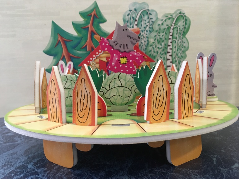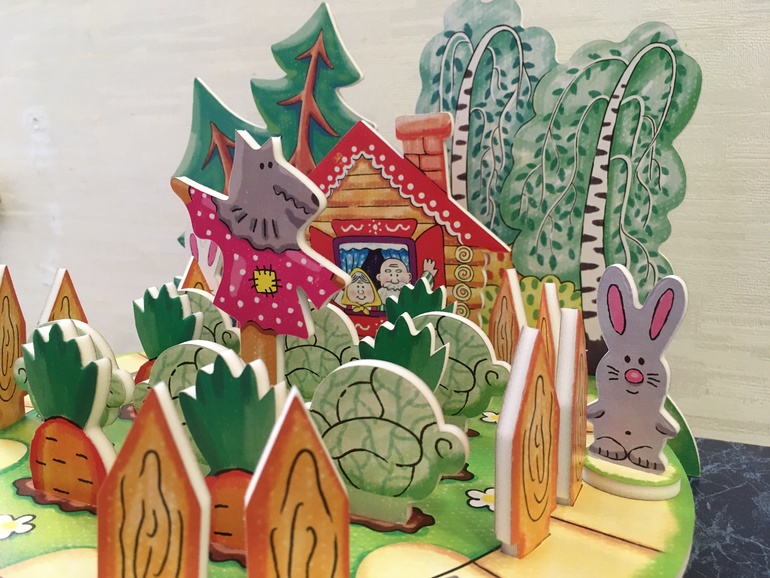 1- зайка срывает кочан капустки (игрок кладёт ее собой) в том случае, если капусты уже нет в огороде, он остаётся ни с чем, но в следующий ход может перебросить фишки для того, чтобы сорвать морковку;