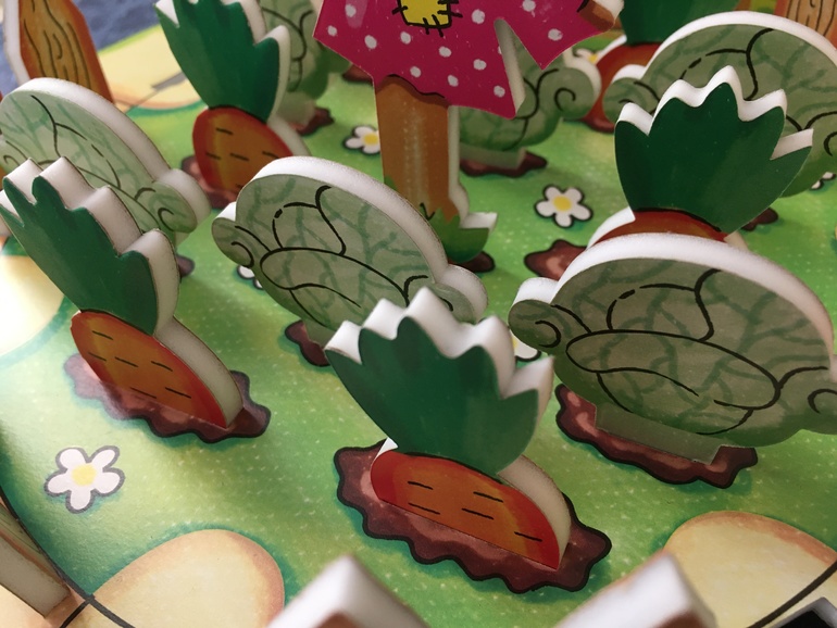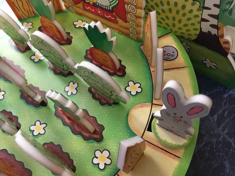 Игровой процесс элементарный. Кидаете фишечки, двигаетесь по полю. Чтобы зайти на огород нужно потратить 1 очко, поэтому, если зайке хватило очков только, чтобы дойти до дырки в заборе, в огород он сразу не