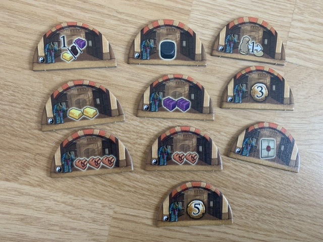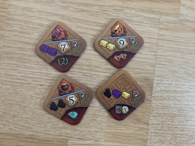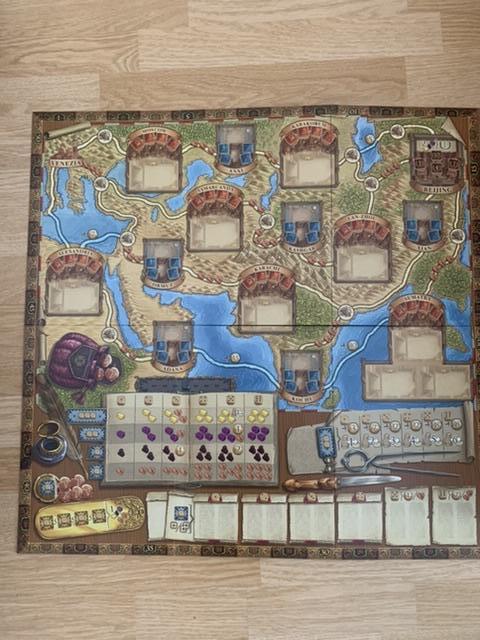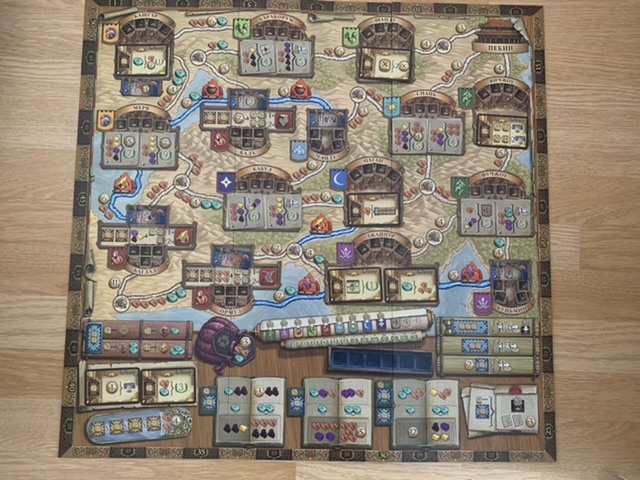 Рядом с полем располагаются ресурсы (золото, специи, шёлк и нефрит), верблюды, деньги и жетоны четырёх разных гильдий каждого по 1 на игрока
