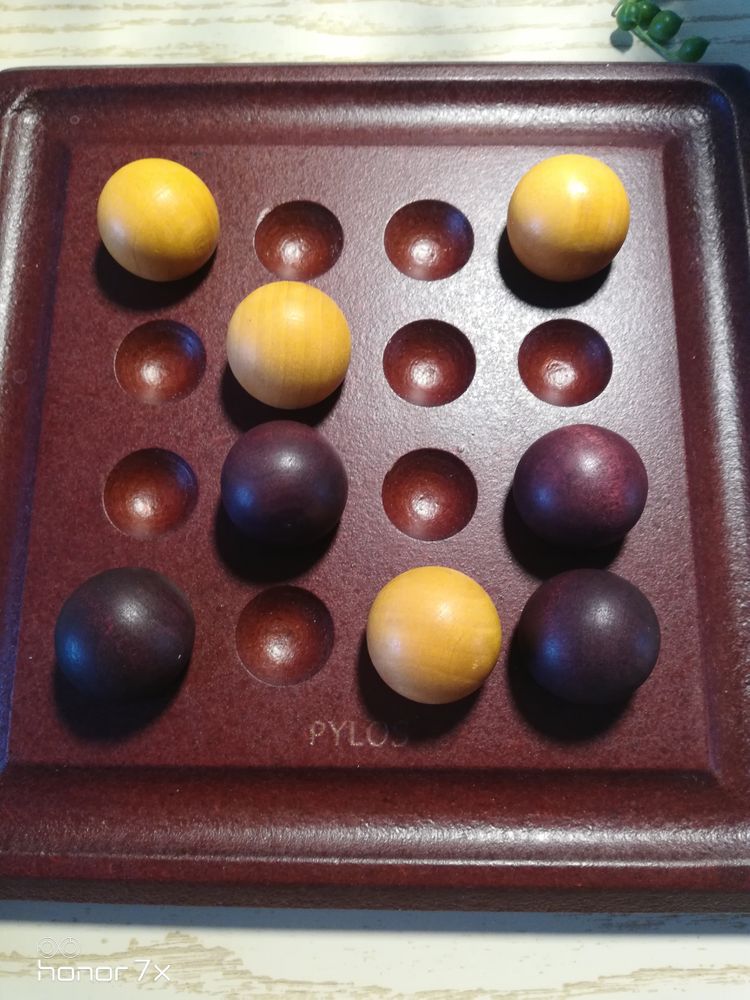 Отдельно расскажу об очаровавшем всех Пилосе (Pylos). Тактильно притягательная быстрая, красивая игра. Тёмные шарики напоминают мне трюфельные конфеты, а золотые Дима назвал жердёлками ( так в Ростовской области, Краснодарском крае называют абрикосы, которые растут в ветрозаградительных полосах полей, они меленькие, почти круглые и медово- сладкие.)