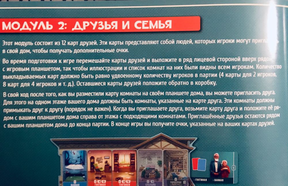 Домик-самая -самая любимая игра моей двенадцатилетней дочери. Уже четвёртый год подряд она играет в Домик и не перестаёт им восхищаться. Никакого приедания, наскучивания нет и в помине. Любовь только крепнет. Я же, как стойкий оловянный солдатик, должна поддерживать компанию, ведь играть дочке больше не с кем. Но за эти три с лишним года Домик мне уже надоел. К тому же больше 47 очков мне ни разу не удалось набрать, расти было некуда. В последние пару месяцев я задумалась о дополнении, и , как оказалось, не напрасно и очень вовремя. Тираж дополнения закончился, найти его в продаже стало невозможно. Но я нашла, купила и устроила дочке сюрприз. Вечером в пятницу погасила верхний свет в комнате, включила настольную лампу и предложила дочке поиграть в любую игру. Она, конечно же, выбрала Домик. Я отправила дочку на кухню за стулом, а сама быстренько отправила на стол коробку с дополнением , вместо основной версии. Дочка вернулась, попробовала открыть коробку, но у неё не получилось, ведь она была запечатана. И тут моя девочка посмотрела на крышку и всё поняла. Как она радовалась! Сколько счастья! Сюрприз удался. Конечно, мы сначала очень долго разглядывали все новые комнаты. Дочка ахала от восторга, у неё сразу появились самые любимые. Налюбовавшись новыми интерьерами, решили поиграть. И тут нас ждало разочарование. Оказалось, что новые карты комнат используются только при игре впятером и вшестером. А если хочется при игре меньшим составом, то нужно провести целые манипуляции по подсчету и замене каждого типа комнат в отдельности. Дочка хотела сейчас же всё заменить, но я отговорила и первый раз мы играли, используя только гостей и карты с планом дома.