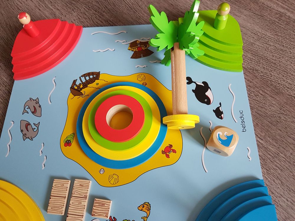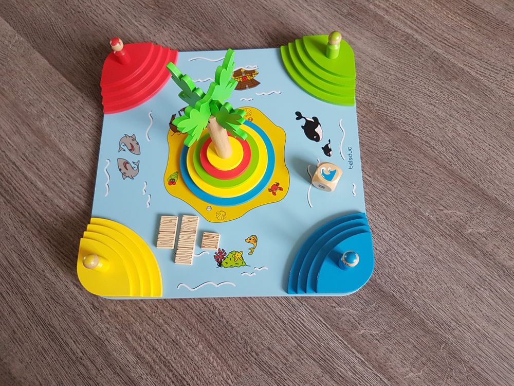 Цель - построить четырёхярусный мост на остров. Кидаем кубик, выпадают разные варианты дощечек. Их надо выставлять. Если выпала волна, снова бросаешь кубик, и теперь уже убираешь выпавшие дощечки. Вот и все правила. Есть микроскопическая доля стратегии, куда лучше положить, чтобы больше вариантов осталось. Для четырёх лет отлично.